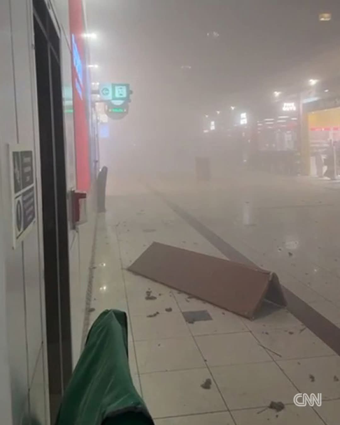 Dramatic footage shows people fleeing a smoke-filled passageway strewn with furniture and debris at Dubai International Airport, where officials confirmed four staff had been injured.